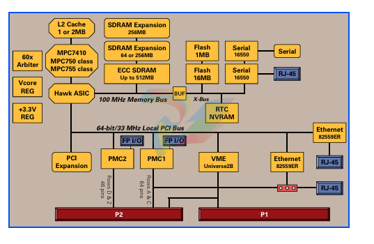 PMC slot. The on-board I/O is routed to P2 and made