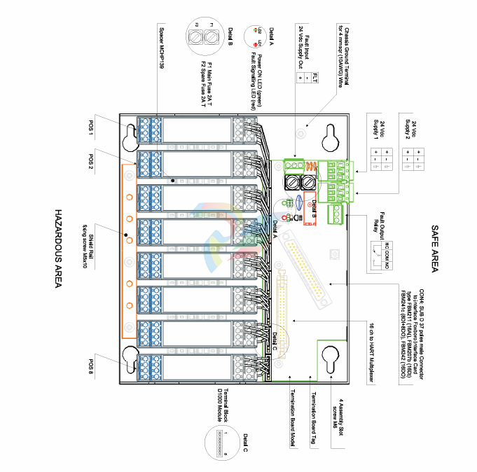 The connections to/from the Hazardous Areas are made at the module terminal blocks,