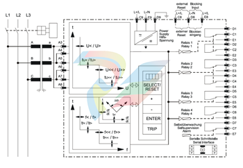 Microprocessor technology with watchdog, effective analog low pass filter for suppressing harmonics when measuring frequency and vector surge, digital filtering of the measured values by using discrete Fourier analysis to suppress higher harmonics and d.c. components induced by faults or system operations, integrated functions for voltage, frequency and vector surge in one device as well as single voltage, frequency and vector surge devices, two parameter sets, voltage supervision each with two step under-/and overvoltage detection, frequency supervision with three step under-/or over frequency (user setting), completely independent time settings for voltage and frequency supervision, adjustable voltage threshold value for blocking frequency and vector surge measuring, display of all measuring values and setting parameters for normal operation as well as tripping via a alphanumerical display and LEDs, display of measuring values as primary quantities Storage of trip values and switching-off time (tCBFP) of 5 fault occurrences (fail-safe of voltage), recording of up to eight fault occurrences with time stamp for blocking the individual functions by the external blocking input, parameters can be set according to requirement, user configurable vector surge measurement 1-of-3 or 3-of-3, reliable vector surge measuring by exact calculation algorithm, suppression of indication after an activation (LED flash), free assignment for output relays, display of date and time, in compliance with VDE 0435, part 303 and IEC 255, serial data exchange via RS485 interface possible; alternatively with RS485 Pro-Open Data Protocol or Modbus Protocol.